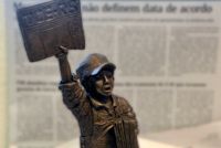 Audiodescrição: fundo com jornal desfocado. Em destaque está a parte superior da estátua - “O Jornaleiro” - oferecida aos vencedores do Prêmio de Jornalismo do TCE-RS: A imagem que aparece em tom de bronze é a de um menino vendedor de jornais, usando um boné, com um maço de exemplares embaixo do braço esquerdo, pressionado contra o corpo e um jornal erguido com o braço direito levantado. Neste jornal pode-se ver no espaço do título a sigla “TCE-RS”.