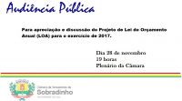 Na segunda-feira, 28, às 19h, ocorre na Câmara de Vereadores de Sobradinho uma audiência pública para apreciação e discussão do Projeto de Lei do Orçamento Anual (LOA) para o exercício de 2017 (Projeto de Lei 091).