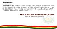Em pauta, o Projeto de Lei 125 do Executivo que autoriza o Executivo Municipal prorrogar por mais 10 anos o prazo de que trata o Art. 2º, letra a, da lei municipal nº 1.714, de 16.12.1996, alterada pela Lei Municipal nº 1.948, de 26.04.1999 e também a doar uma área de terras para implantação e instalação do Campus da UNISC- Universidade de Santa Cruz do Sul em Sobradinho.