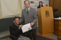 Na foto o Conselheiro Algir Lorenzon entrega o Diploma para o Presidente da Câmara.