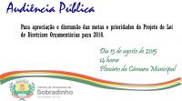 Na quinta-feira, 13, às 14h, ocorre na Câmara de Vereadores de Sobradinho uma Audiência Pública para apreciação e discussão das metas e prioridades do Projeto de Lei de Diretrizes Orçamentárias (LDO), para o exercício de 2016. Toda a população de Sobradinho está convidada a participar desse importante evento de participação popular.